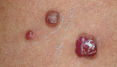 Bacillary angiomatosis (BA) is an exanthem characterized by cutaneous vascular lesions in association with Bartonella (previously Rochalimaea ) infections. Bartonella species also cause cat-scratch disease, prolonged fever, hepatosplenic disease, ocular manifestations (including Parinaud oculoglandular syndrome), encephalopathy, hemolytic anemia, osteomyelitis, endocarditis, glomerulonephritis and pulmonary disease. BA occurs primarily in immunocompromised individuals and was originally described (and once seen quite commonly) in patients with acquired immunodeficiency syndrome (AIDS). It has been rarely documented in immunocompetent children. BA is caused by B. henselae and B. quintana , and transmission is via the body louse, a cat scratch, or cat fleas. The lesions may involve various tissues, including brain, bone, lymph nodes, GI tract, respiratory tract, and bone marrow. Osseous lesions are most commonly seen with B. quintana infection, and visceral involvement is caused almost solely by B. henselae. However, skin lesions are the most common manifestation, may be caused by both species, and present as disseminated red to purple papules generally no larger than 1 to 2 cm in diameter. The clinical differential diagnosis may include PG and Kaposi sarcoma. Occasionally, BA may present with ulcerative lesions. Liver peliosis is a similar condition affecting the liver and lymph nodes and usually caused by B. quintana.