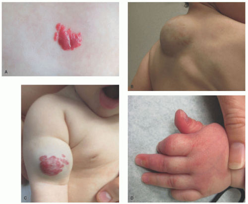 FIGURE 25-1. A, Superficial infantile hemangioma. B, Deep infantile hemangioma. C, Mixed, superficial, and deep infantile hemangioma. D, Infantile hemangioma with minimal or arrested growth.