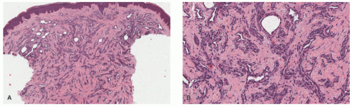 FIGURE 25-10. Microvenular hemangioma. A and B, Interstitially arrayed small, thin-walled vessels dissecting between dermal collagen fibers (40× and 100× magnification). Digital slides courtesy of Path Presenter.com.