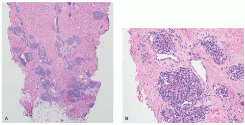 FIGURE 25-12. Tufted angioma. A, Rounded lobules of small, thin-walled vessels in the deep dermis, with minimal intervening stromal changes and absence of subcutaneous extension (H&E-stained section, 40× magnification). B, Crescentic lymphatic channels encircle individual lobules (H&E-stained section, 200× magnification).