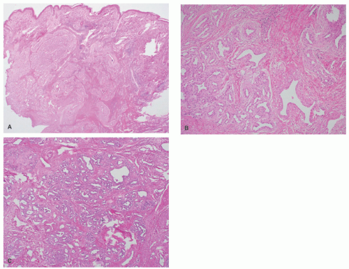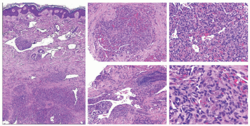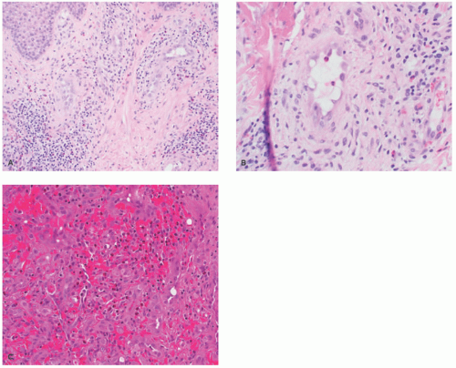PG exhibits an exophytic, polypoid tumor predominantly within the upper dermis, often with central shallow ulceration and an adjacent epidermal collarette (Figure 25-7A). Clusters of capillaries and venules are lined by plump endothelial cells and are typically organized into discrete lobules by interlacing strands of fibrotic stroma. Dermal edema and lymphocytes are commonly present, as are neutrophils in cases of ulceration. A larger feeding arterial vessel may be present at the base of the tumor. PG with partial regression