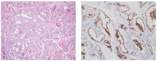PILA demonstrates both slit-like and widely dilated vascular channels lined by hyperchromatic endothelial cells with prominent hobnailing (Figure 25-15). The characteristic finding is of intravascular papillary clusters (“tufts”) of endothelial cells surrounding a central hyaline core. These tufts may resemble glomeruli and can fill and occlude vascular channels. Dense lymphocytic inflammation may also be present adjacent to vascular structures.22 The differential diagnosis includes papillary endothelial hyperplasia (Masson’s phenomenon), retiform hemangioendothelioma, and the glomeruloid hemangioma associated with POEMS syndrome. The characteristic appearance of tufts in PILA, with eosinophilic cores and surrounding roundish endothelial cells, typically permits distinction.
