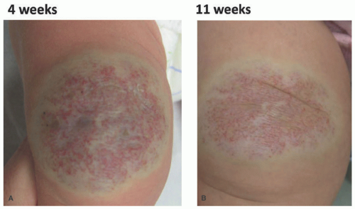 FIGURE 25-3. Rapidly involuting congenital hemangioma of the left leg (A) at 4 weeks (B) at 11 weeks.