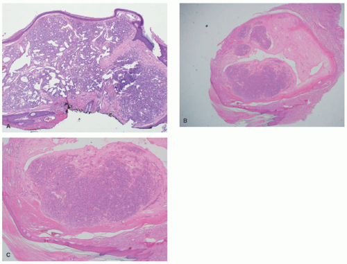 TA exhibits well-defined lobules of closely apposed capillaries within the dermis and upper subcutis. Given their notably round, blue appearance at scanning magnification, these lobules are colloquially referred to as “cannonballs” (Figure 25-12A and B). Endothelial cells are often subtly spindled.37 Individual lobules exhibit a surrounding thin, crescentic lymphatic channel, which labels positively with lymphatic marker immunostains such as D2-40 and PROX-1. Spindled endothelial cells may demonstrate similar positivity, although most of the central portions of lobules are D2-40 negative.38