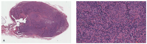 FIGURE 25-8. Spindle cell hemangioma. A, Well-circumscribed tumor with dense cellularity centrally and dilated thin-walled vessels peripherally (20× magnification). B, Sheets of spindled cells that may resemble nodular Kaposi’s sarcoma (200× magnification). Digital slides courtesy of Path Presenter.com.