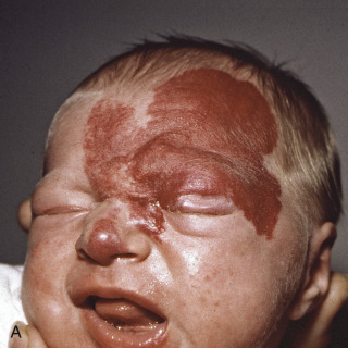IH may present first as telangiectasias, pink macules, or patches or bruise-like lesions. Early lesions can mimic a port wine stain ( Fig. 32.1A ). Rarely, neonates present with well-developed lesions.