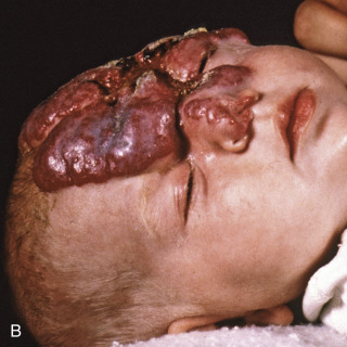 A, Infantile hemangioma at the time of presentation. B, Fully evolved infantile hemangioma (same infant as seen in A), with partial ocular and nasal obstruction.