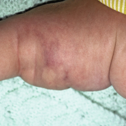 Thrombosed deep hemangioma in a neonate who developed Kasabach-Merritt syndrome.