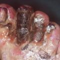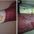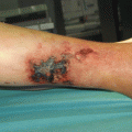 Other manifestations: infiltrated erythema; hemorrhagic vesicles; ulcers; inflammatory, tender, or painful dermal or hypodermal nodules; livedo racemosa; infarcts; and digital gangrene. Lesions affect primarily the lower limbs. Upper extremity, trunk, head, and neck involvement are not usual and may be considered as a sign of severity and/or of a systemic vasculitis (Figs. 20.2, 20.3, and 20.4).