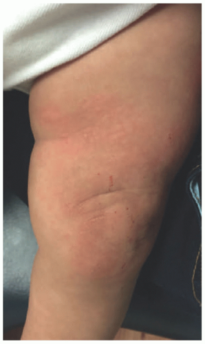 FIGURE 6-1. Acute urticarial papules and plaques with excoriation on the knee of a 7-month-old infant secondary to peanut allergy.