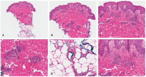 The histopathologic findings present in association with arthropod bite reactions/papular urticaria are variable (Figure 6-10): those depend on the arthropod subtype, the duration of the clinical lesion, the immunologic reaction, the presence or absence of arthropod parts, and the discharge of toxins. Changes caused by tick bites involve both the epidermis and the dermis. In the epidermis, there is variable acanthosis, which in some cases can be exuberant and have a pseudoepitheliomatous appearance. Epidermal spongiosis can also be seen, particularly in the acute phases. The spongiotic reaction can be localized to the site of the bite, or more extensive, with multiple intraepidermal vesicles and sometimes frank necrosis. Eosinophilic spongiosis can be a particular feature seen in arthropod bites. The dermal reaction is characterized by wedge-shaped dense foci of inflammatory cells consisting of lymphocytes, histiocytes, plasma cells, and eosinophils especially in the periappendageal region. Secondary lymphoid follicles with germinal centers are formed in some lesions. Mouth parts of the tick can be present sometimes, typically in the mid dermis and covered by a down-growth of the epidermis. The arthropod parts can be polarizable. Reactions to fleas, fire ants, mosquitoes, and spider envenomation show a predominance of neutrophils with vasculitic foci. Hemorrhage and edema can also be prominent.