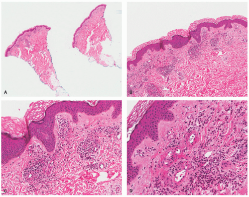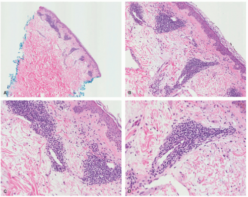 FIGURE 6-11. Erythema annulare centrifugum. The characteristic features are those of a lymphocytic vasculitis. A tight perivascular infiltrate in the superficial to mid dermis is noted, without significant epidermal changes (A,B). The infiltrate has also been described to as having a “coat sleeve” appearance (C,D).