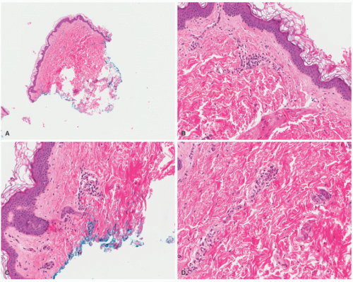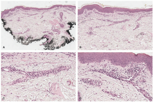Urticaria is one of the conditions where the clinical finding can be quite drastic, but the histologic aspects are very underwhelming (Figure 6-4). Urticaria is one of the conditions that enter the pathologic diagnosis of “normal skin.” Early lesions of urticaria show intravascular clusters of neutrophils within the lumen, without much inflammation extravasated outside the vessels. Later on, there is a superficial and deep, or superficial to mid dermal, perivascular and interstitial mixed inflammatory infiltrate. The inflammatory cells include neutrophils, eosinophils, lymphocytes, and histiocytes. Papillary dermal edema and vascular congestion can