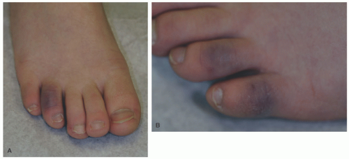 FIGURE 6-15. Firm, indurated nodules, with a dusky and hemorrhagic appearance are seen on the toes (A,B).