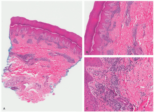 FIGURE 6-16. Perniosis. There is a superficial and deep, perivascular and periadnexal lymphocytic infiltrate in an acral location (A). Marked papillary dermal edema is also seen (B,C).