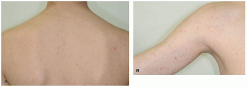 FIGURE 6-17. Two- to three-millimeter reddish-brown macules and papules on the trunk and proximal extremities (A,B).