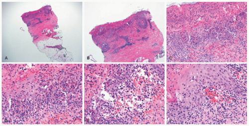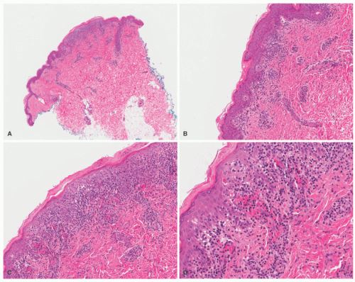 scattered dermal eosinophils are present. A “deep” form of gyrate erythema has been described, in which the inflammatory infiltrate extends to involve the deep vessels in the reticular dermis. The latter form lacks epidermal changes.41,42,43,44