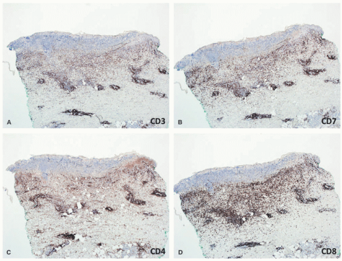 FIGURE 6-20. Pityriasis lichenoides et varioliformis acuta—immunohistochemistry. Most of the lymphocytes are CD3+ T-cells (A) with retained expression of CD7 (B). The CD4:CD8 ratio is markedly inverted, with a large predominance of cytotoxic T-cells (C,D).