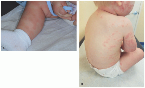 Infants develop an asymptomatic 2 to 3 cm arcuate and annular eruptions with raised borders that classically last a few days, but frequently can recur for months to rarely years (Figure 6-12). Lesions resolve without hyperpigmentation or scarring, and there are no systemic symptoms.46,47