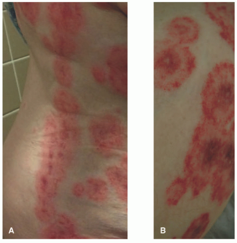 FIGURE 6-3. Urticaria multiforme. Annular, serpiginous, and polycyclic urticarial plaques are present (A,B).