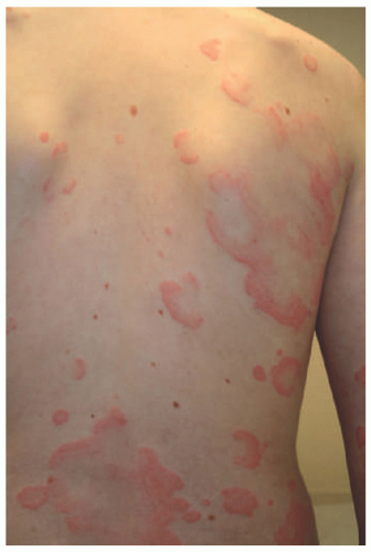 Lesions are erythematous, edematous wheals frequently with central clearing that are very pruritic. They range in size from pinpoint papules to large plaques (Figure 6-1).