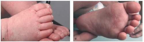 FIGURE 6-8. (A) Erythematous papules with scaling and crusting on the foot of a scabies-infested infant. (B) Linear burrows and erythematous papules on the sole of an infant’s foot with scabies infection.