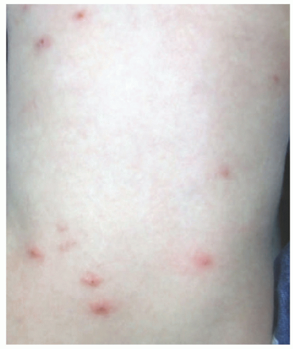 FIGURE 6-9. Urticarial papules on the trunk secondary to blea bites on a young child with central punctum, vesiculation, and scabbed excoriation.