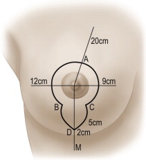 The same skin markings can be used to perform either breast reduction or mastopexy, with the only difference being during surgery where tissue removal is performed where indicated. A line from the sternal notch to the xiphoid process is drawn (midline). The meridian line is drawn from the midclavicle to the NAC, crossing the inframammary crease (‘M’ point), which is 12 cm or more from the midline. The ‘A’ point is marked 18–20 cm from the clavicle or 20–22 cm from the sternal notch. With a horizontal maneuver, the breast is moved medially and laterally and two points (‘B’ and ‘C’) are marked, using the vertical line inferior to the areola as a reference, which demonstrates the skin in excess. Using these three points as a reference, a curved line is drawn around the areola in an oval shape, similar to the periareolar technique. The medial portion of this line is, on average, 9 cm from the midline, and the lateral portion is, on average, 12 cm from the anterior axillary line. Point ‘D’ is marked, 2–4 cm above point ‘M’. Points ‘BD’ and ‘CD’ are joined together in a curved line of approximately 5–7 cm ( Figures 15.1,15.2 ).