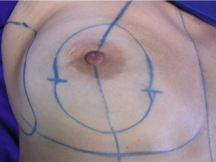 Recently, working with the philosophy of the periareolar technique associated with the vertical scar technique, it has been possible to reduce scar length, thus avoiding its elongation across the inframammary crease by compensating for skin excess around the areola. It was observed that in every single technique performed, the breast shape after descent resulted in loss of upper pole fullness. Some authors used the inferior portion of breast tissue to fill in the upper pole or the areola to achieve a better breast shape. In addition to scar evolution, since 1994 we have been using a sling of major pectoralis muscle to allow long-term maintenance of upper pole volume ( , ). In order to obtain a better long-term outcome, it is mandatory to redefine breast shape with internal tissue, not with skin sutures, therefore avoiding exaggerated scar tension. It has been observed that passing the chest wall based flap under a sling of pectoralis major muscle permits a longer definition of the breast shape and upper pole fullness. Liposuction on the lateral breast area helps to better define the lateral fold.