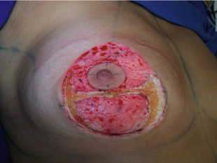 Surgery begins with de-epithelialization of the area previously described keeping the subdermal plexus intact. Dermis is incised along the marked lines, up to 1.5–2 cm superior to points ‘B’ and ‘C’ sparing the upper portion of the areola, which is the pedicle for the NAC ( Figure 15.3 ). Dermis is also incised horizontally 1 cm inferior to the areola and subcutaneous tissue is incised perpendicular to the plane of the thoracic wall, reaching the pectoral fascia at the level of the fourth intercostal space.