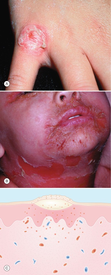 Gram-staining of the clear or cloudy fluid from a bulla reveals gram-positive cocci. S. aureus grows out in more than 95% of the cultures. Biopsy of impetigo, which is usually not done because the diagnosis is obvious, reveals a subcorneal pustule or blister ( Fig. 10.1C ).