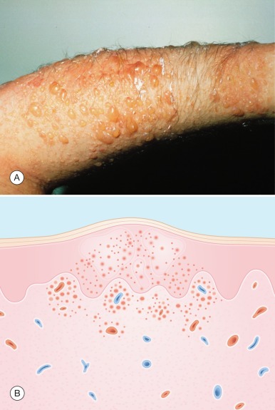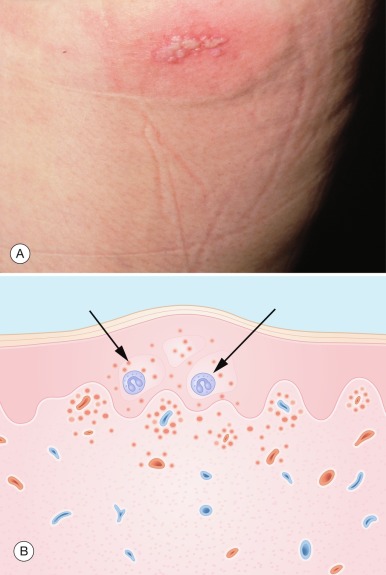 Because acute contact dermatitis is characterized by a vesicular eruption ( Fig. 10.2A ), it is mentioned briefly here. In Chapter 8 , it is discussed in more detail, along with other eczematous eruptions.