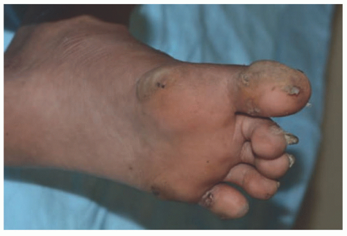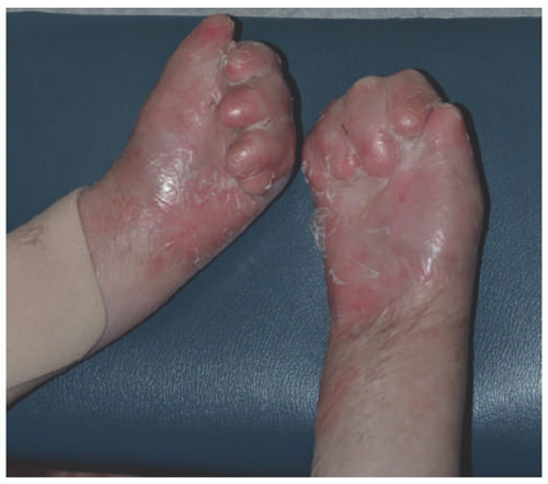 FIGURE 4-14. Recessive dystrophic epidermolysis bullosa, generalized severe subtype with associated mitten deformity. (Courtesy of Kristen Hook, MD.)
