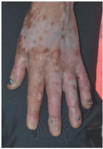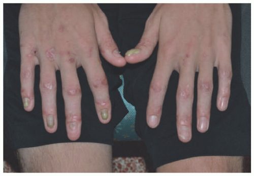 FIGURE 4-10. Dominant dystrophic epidermolysis bullosa. Note milia and scarring over extensor joints and associated nail dystrophy. (Courtesy of Kristen Hook, MD.)