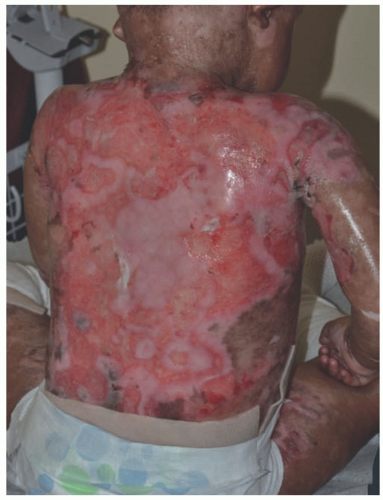 FIGURE 4-12. Recessive dystrophic epidermolysis bullosa, generalized severe subtype. Note generalized erosion, scarring, and dyspigmentation. (Courtesy of Kristen Hook, MD.)