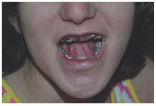 FIGURE 4-15. Recessive dystrophic epidermolysis bullosa. Note absent tongue papillae and enamel defects with associated tooth decay and concomitant microstomia. (Courtesy of Kristen Hook, MD.)