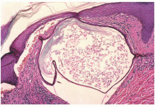 Milia formation is another well-known histopathologic finding associated with DEB. Milia are small dermal cysts lined by squamous epithelium and containing loose keratin (they are essentially miniaturized epidermal inclusion/epidermoid cysts) (Figure 4-17). In one case report, multiple milia was the presenting skin manifestation of DEB.13 However, any disorder that causes repeated skin damage may result in milia formation, making the finding of milia nonspecific (the lesions of EBA, eg, also frequently show milia). Immunomapping studies show the presence of KRT5 and KRT14, laminins, and type IV collagen along the roof of the blister. On ultrastructural examination, anchoring fibrils are often altered or reduced and may even be absent in severe recessive dystrophic forms of EB.