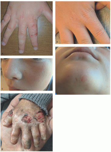 FIGURE 4-18. Porphyria. A, A boy with erythropoietic protoporphyria with a small vesicle and erosions of the dorsal hand during an acute flare. B-D, The same patient after 2 years with subtle atrophic scarring in the sun-exposed areas of the nose, cheek, upper lip, chin, and dorsal hand. E, A child with congenital erythropoietic porphyria. There are erosions on the dorsal hand, and severe, mutilating scarring resulting in shortening of the digits and loss of fingernails.
