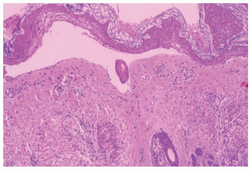 FIGURE 4-17. Recessive dystrophic epidermolysis bullosa. This image shows focal subepidermal separation, dermal scar, and milium formation—a characteristic feature of this form of epidermolysis bullosa.