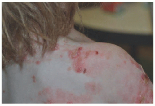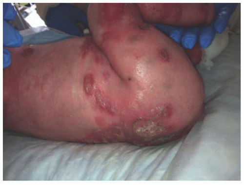 FIGURE 4-2. Generalized epidermolysis bullosa simplex. Flaccid blisters and erosions on an erythematous base. (Courtesy of Kristen Hook, MD.)