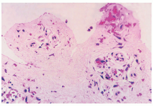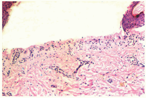 The different subtypes of porphyrias and pseudoporphyria appear histologically similar. When blister formation is present, histologic sections generally show a subepidermal blister that is free of cells or cellular debris (Figure 4-19). Lesions typically exhibit a small amount of associated chronic inflammation. The key histologic feature in the porphyrias is the presence of thick-walled, hyalinized vessels within the superficial (and sometimes deep) dermis. Periodic acid Schiff (PAS) staining highlights the material surrounding the blood vessels and may also demonstrate PAS-positive globules along the epidermal portion (roof) of the blister (sometimes referred to as “caterpillar bodies”) (Figure 4-20).22,23,24 The lesions may also show sclerosis of the dermis, and festooning (the presence of residual dermal papillae structures pushing into the blister cavity) is often a feature (Figure 4-21).22,23,24 On the basis of ultrastructural studies and antigen mapping, the level of splitting in the blisters is variable, but most often involves the lamida lucida.25 Accordingly, DIF or ICH antigen mapping studies most often demonstrate type IV collagen and laminin along the floor of the blister, and BP-1 antigen along the roof of the blister.25 DIF testing also shows the deposition of C3, IgG, and IgM around vessels in the superficial dermis (sometimes described as “doughnut-like” blood vessels, because of their thickened appearance).26 Indirect immunofluorescence (IIF) is negative in these disorders.
