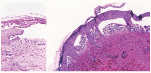 FIGURE 4-22. Epidermolysis bullosa acquisita. The left image shows a relatively infiltrate-poor subepidermal bulla; a few neutrophils can be seen within degenerated portions of the epidermis and in the papillary dermis. The right image shows papillary neutrophilic microabscesses—a feature in some examples of epidermolysis bullosa acquisita that can also be seen in other immunobullous diseases.