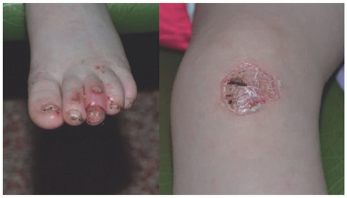 FIGURE 4-7. Junctional epidermolysis bullosa. Note fingernail involvement and dyspigmentation. (Courtesy of Kristen Hook, MD.)