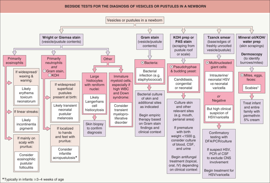 Bedside tests for the diagnosis of vesicles or pustules in a newborn.