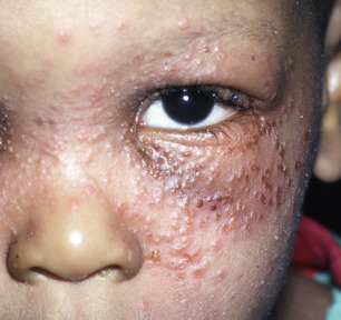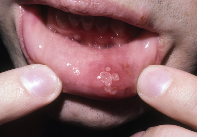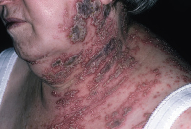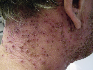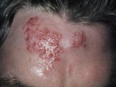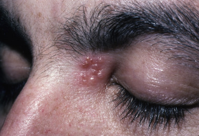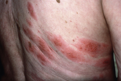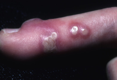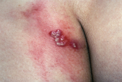 Skin lesion distribution is helpful when distinguishing between common vesicular eruptions, including the grouped localized vesicles and erosions seen in herpes simplex virus, compared with the dermatomal vesicular eruptions secondary to herpes zoster virus. As with other infections, the patient’s underlying immune status also plays a role in the clinical findings, as evidenced by the verrucous herpetic lesions or severe disseminated herpes zoster seen in immunocompromised patients. Other underlying conditions, such as concurrent eczema, can also contribute to the patterns of involvement as seen in eczema herpeticum and the newly coined eczema coxsackium due to Coxsackie virus A6. Obtaining viral cultures and polymerase chain reaction specimens from these lesions is a common way to establish the exact cause of many vesicular viral eruptions.