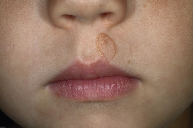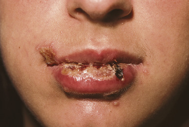 Herpes labialis. Erythematous erosions clustered on the right lower lip in a patient with labial herpes. This young girl also had herpes-associated erythema multiforme (see Chapter 20 ).