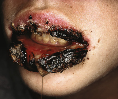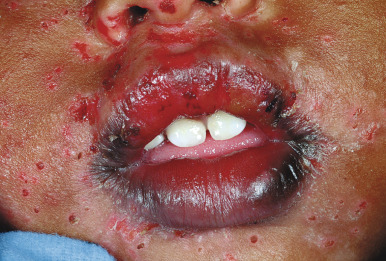Herpetic gingivostomatitis. Lip erosions with multiple perioral herpetic lesions.
