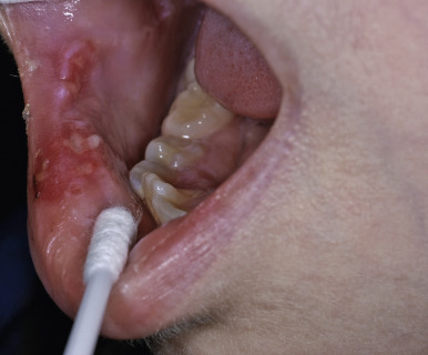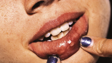 Aphthous stomatitis. Multiple shallow erosions of the labial mucosa.