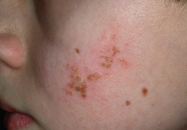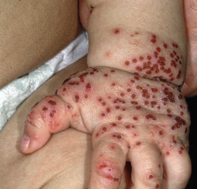 Eczema herpeticum. This toddler with chronic atopic dermatitis had an explosive onset of fever and widespread vesicles with crusting in eczematous areas. Note the monomorphous nature and clustering of these crusted papules with a few intact small vesicles on the dorsal hand.