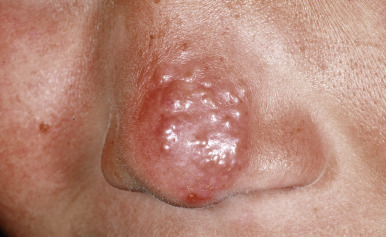 Cutaneous herpes. Coalescing vesicles on a red base over the distal nose.